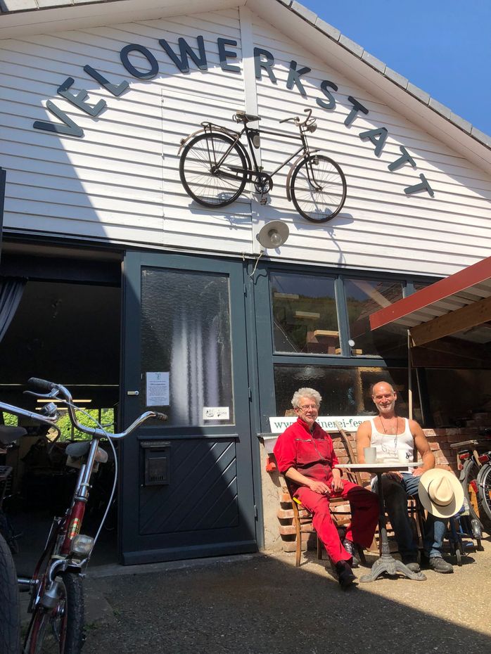 Als Heiko sein Faible für kunstvolle Oldtimer-Räder entdeckte und mit einem Planetengetriebe nicht mehr weiter wusste, traf er in einer Werkstatt auf Ally (Ernst-Albrecht), der sich aufopferungsvoll um seinen ratlosen Kunden kümmerte – bis das Problem erkannt und gelöst war (es lag letztendlich an einer kaum sichtbaren Abnutzung einer Sperrklinke). Das Zusammentreffen Allys mit seinem neuen Praktikanten Heiko gipfelte letztlich in der Gründung der Velowerkstatt. Die beiden „Rentner“ ohne Ruhestand dürfen jetzt alles, müssen aber nichts mehr. Die Velowerkstatt als kreativer Gnadenhof für schaffige Unverdrossene. Das Leben meint es gut mit ihnen.
