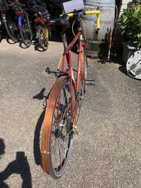 "Holzschutzbleche" an einem 60er Jahre Mercier und geflochtene Speichen - three leading, three trailing - mit einer alten Bahnradnabe.
