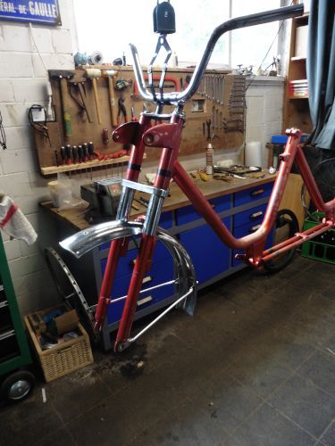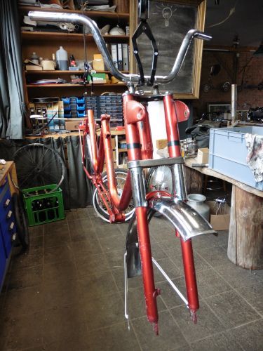 Von dieser abscheulichen Schönheit, ein Klassiker des Bielefelder Zweiradherstellers, stammt diese Dame-Dame-Ausführung. Rixe hat sich v.a. mit Motorrädern und Kleinkrafträdern einen Namen gemacht, weshalb dieses Tandem auch klare Züge und Komponenten eines Mofas trägt wie z.B. der Vorderbau mit der gefederten Gabel, Beleuchtung, verstärkte Speichen etc.